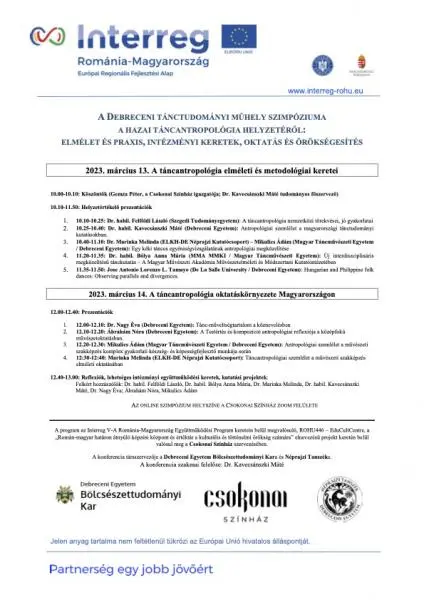 A Csokonai Színház az Interreg Románia-Magyarország Európai Regionális Fejlesztési Alap pályázata keretében 2023. első felében három nemzetközi táncantropológiai konferencia megszervezését bonyolítja le. Az első alkalomra március 13-án és 14-én került sor A Debreceni Tánctudományi Műhely szimpóziuma a hazai táncantropológia helyzetéről: elmélet és praxis, intézményi keretek, oktatás és örökségesítés címmel. A két napos tanácskozáson a tanszék több oktatója mellett a debreceni Néprajzi Tanszéken működő tánctudományi műhelyhez is kötődő kutatók (többek között Az ELKH-DE Néprajzi Kutatócsoport, a Magyar Tánctudományi Egyetem és az MMA Művészetelméleti és Módszertani Kutatóintézet képviseletében) tartottak előadásokat és felszólalásokat a hazai és nemzetközi táncantropológia elméleti és módszertani kérdéseiről, magyarországi helyzetéről, oktatáskörnyezetéről. A márciusi konferenciát további kettő követi áprilisban és júniusban. A konferenciák főszervezője tanszékünk oktatója, Dr. Kavecsánszki Máté.