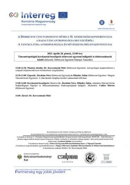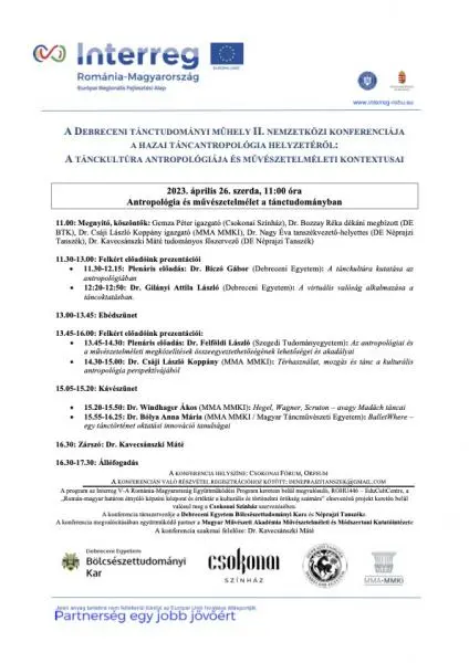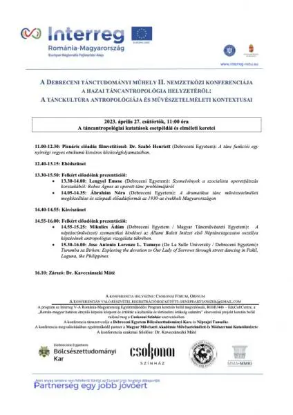 A Debreceni Tánctudományi Műhely II. nemzetközi konferenciája a hazai táncantropológia helyzetéről: A tánckultúra antropológiája és művészetelméleti kontextusai – 2023. április 26 – 28.
